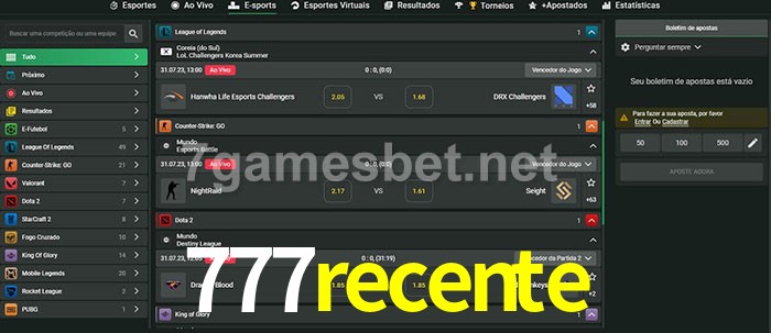 O 777recente oferece uma grande seleção de opções de apostas em e-sports com probabilidades competitivas